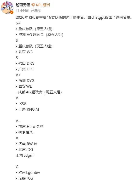 chatgpt分析春季赛战队纯上限排名,狼和AG原五人组最强